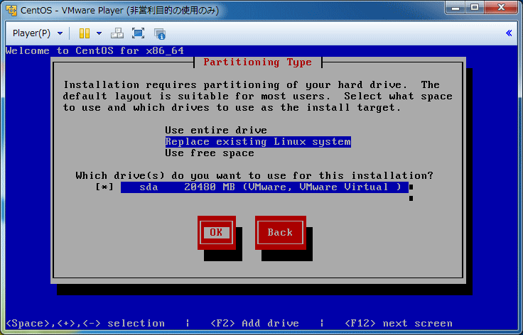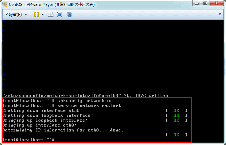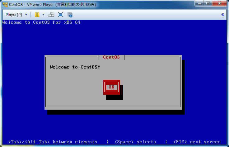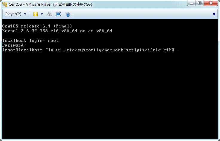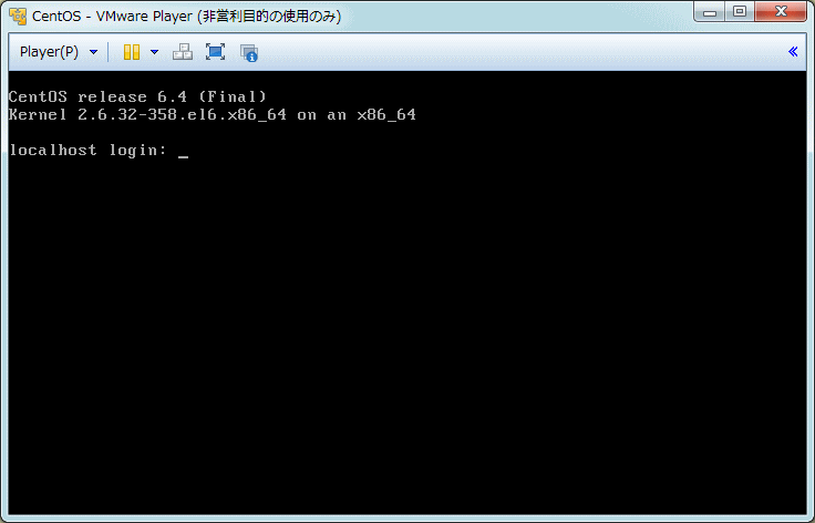 ※ ウィンドウ枠内をクリックした時点で、キーボード/マウス制御が VMware Player に乗っ取られますが、