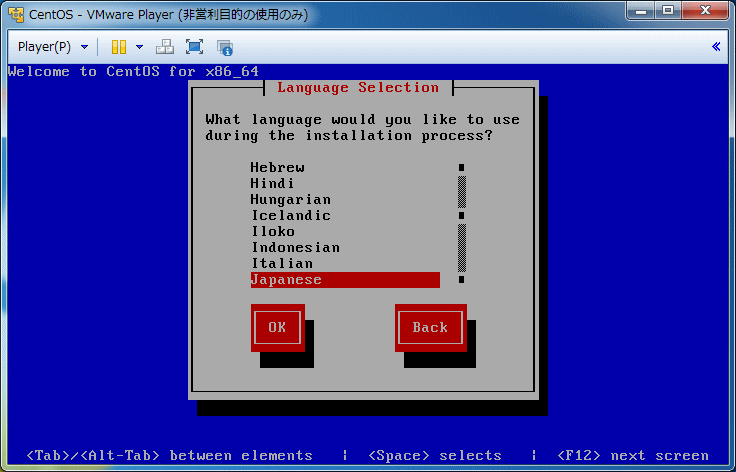 言語選択では Japanese をカーソル上下で選択し、Enter キーを押します。