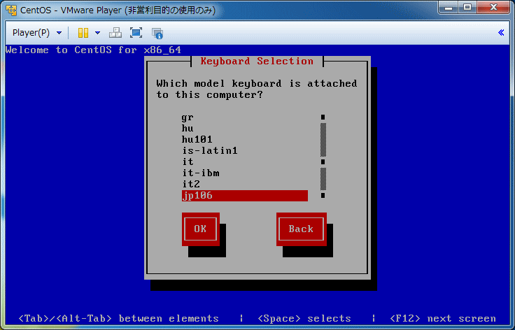 キーボードセレクトでは jp106 が選択されていることを確認し、 Enter キーを押します。
