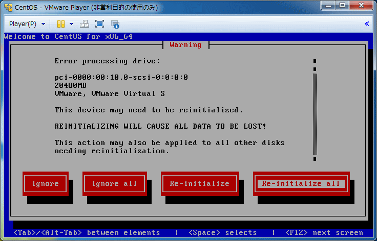 すると、下記の画面が表示されますので、カーソルキーの左右で"Re-initialize all"を選択し、