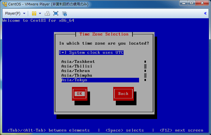 タイムゾーンの設定画面では、カーソルキーの左右で"OK"ボタンを選択し、Enter キーを押します。
