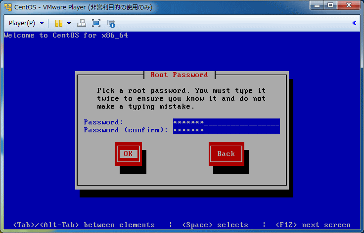 すると Password (confirm) の欄にカーソルが移りますので、同じくパスワードを入力し、Tabキーを押します。