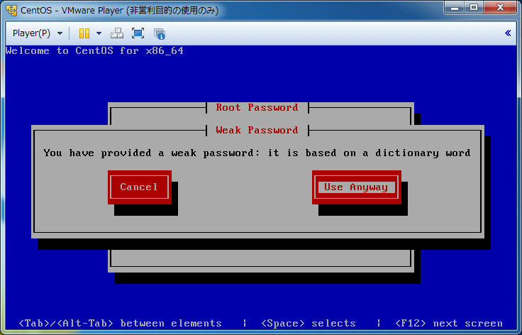 パスワード強度が低い場合以下のような画面がでますが、カーソルキーの左右で Use Anyway を選択し、Enterキーを押します。