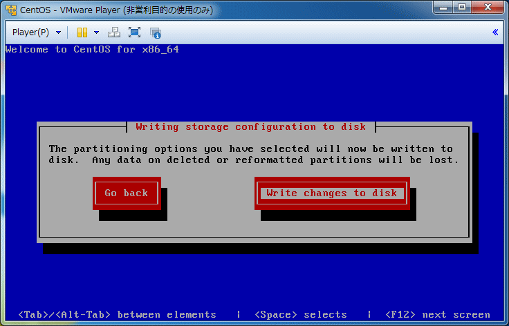 以下の画面になったら、カーソルキーの左右で"Write changes to disk"を選択し、Enterキーを押します。