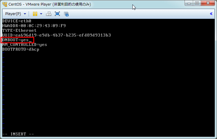 ここで Insert キーを1回押して、5行目に表示されている ONBOOT=no を ONBOOT=yes に書き換えましょう。