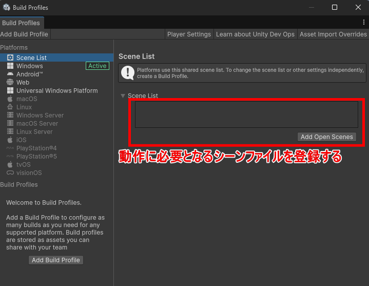 ビルド用のサブウィンドウで、アプリケーション動作に必要なシーンを登録する