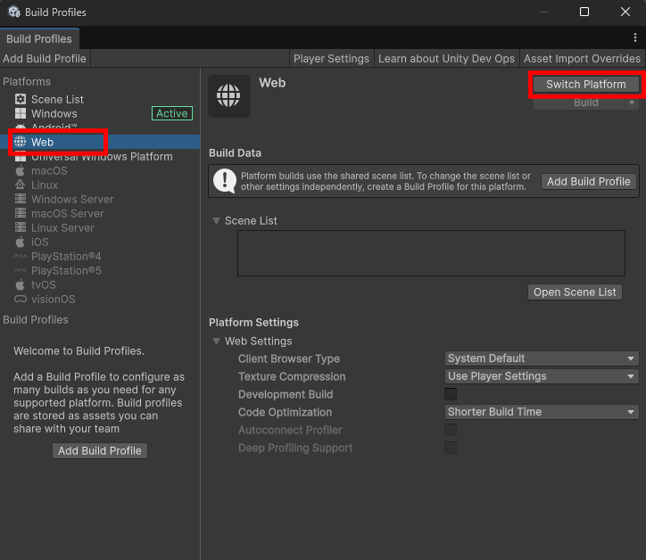 続けて、Build Profiles ウィンドウの左側メニューから「Web」を選んでください。