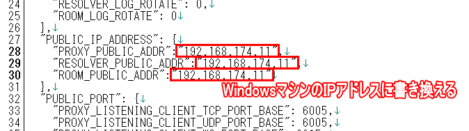の3項目について、事前に記録していた Windows マシンのIPアドレスに書き換えてください。・PROXY_PUBLIC_ADDR ・RESOLVER_PUBLIC_ADDR ・ROOM_PUBLIC_ADDR