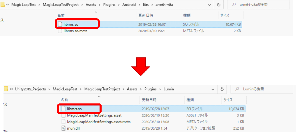 同様に、Assets/Plugins/Android/arm64-v8a/mrs.so を、 Assets/Plugins/Lumin ディレクトリ内にコピーします。